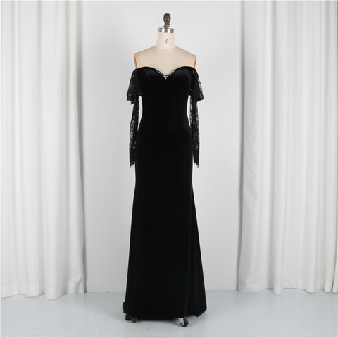 OEM Custom Lady Lace Langarm Samt Schwarz Off-Shoulder Langes boden langes Abendkleid